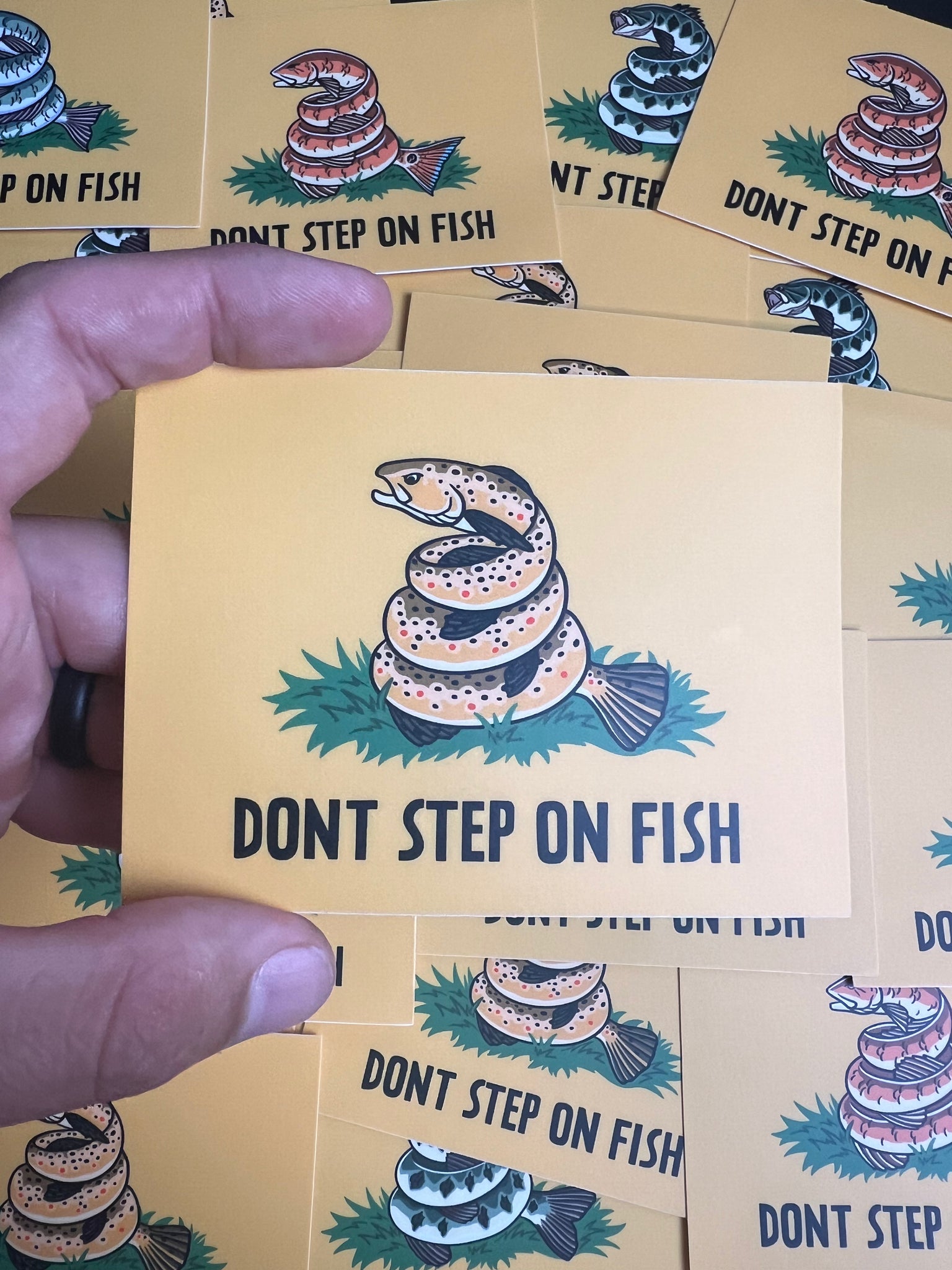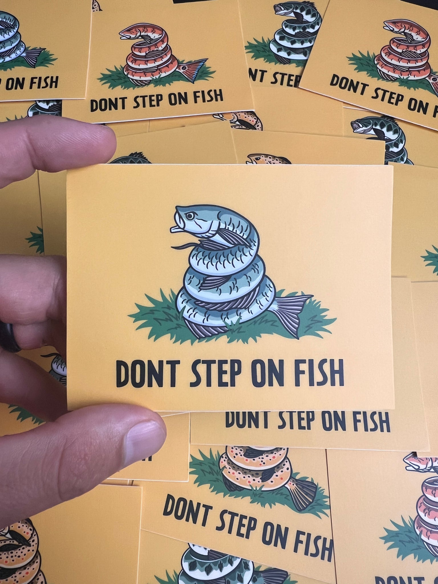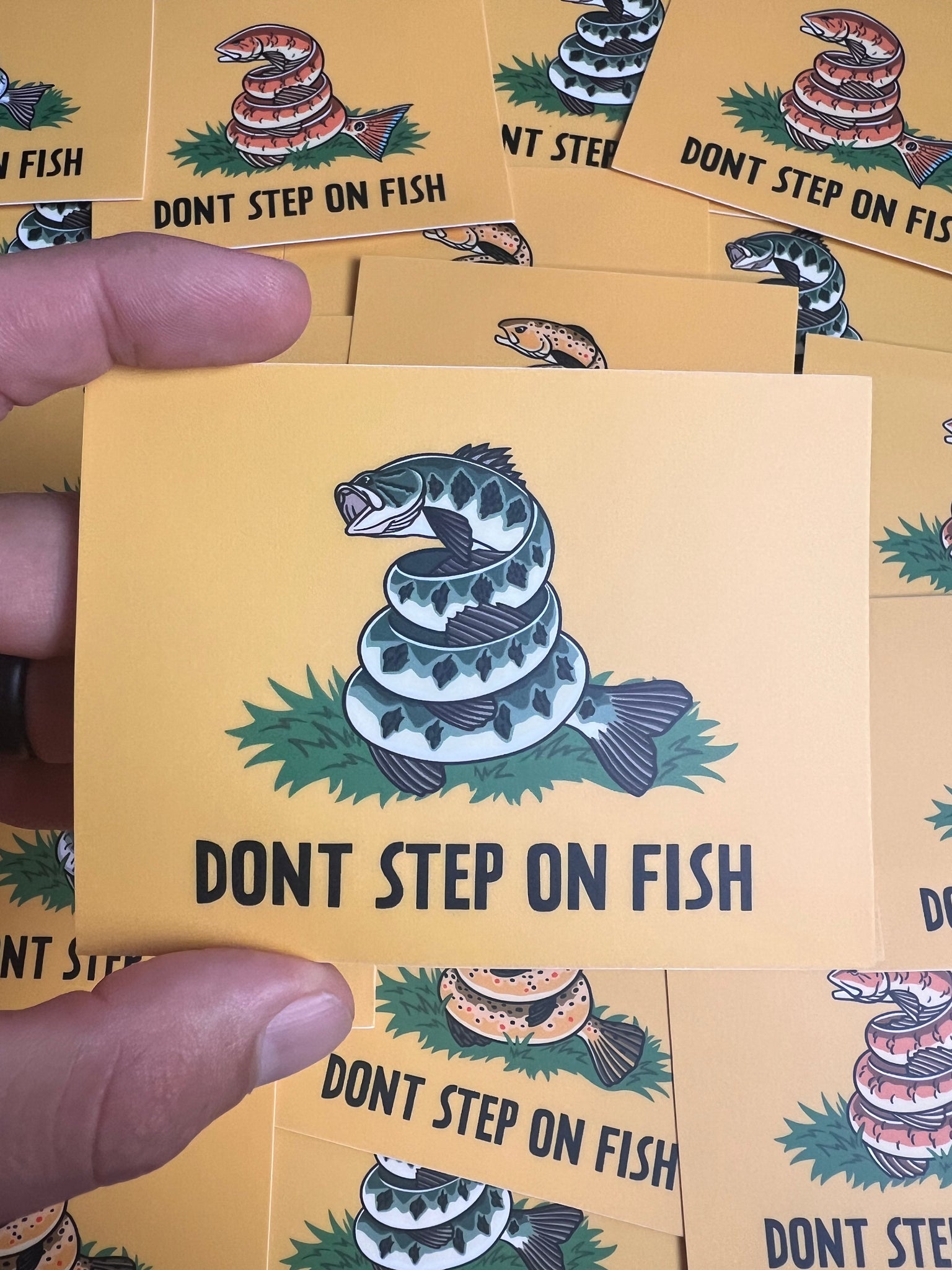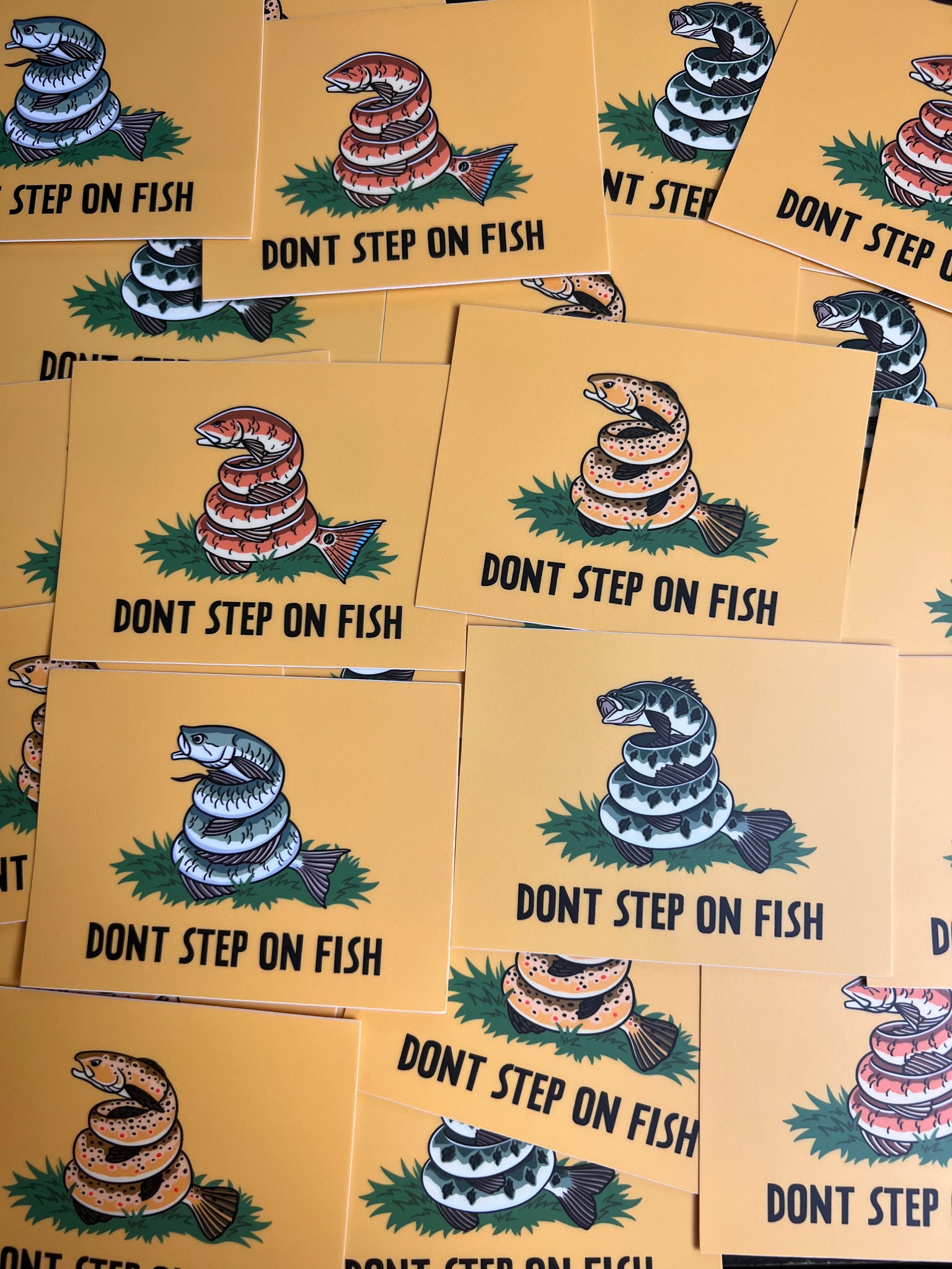 "DONT STEP ON FISH" 4 x 3 Inches water/weather proof, made in USA, custom art work by Off the Grid John. Perfect for coolers, vehicles, tackle boxes bottles and more.